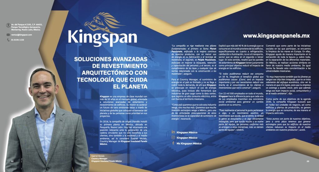 Av. del Parque # 2105, C.P. 66655, Parque Tecnológico Aeropuerto, Monterrey, Nuevo León, México. www.kingspanpanels.mx/ ventas@kingspan.com 81 8196 1150 LinkedIn: Kingspan México Instagram: Kingspan México Facebook: Mx Kingspan México Gabriel Moisés Country Manager Kingspan Insulated Panels México